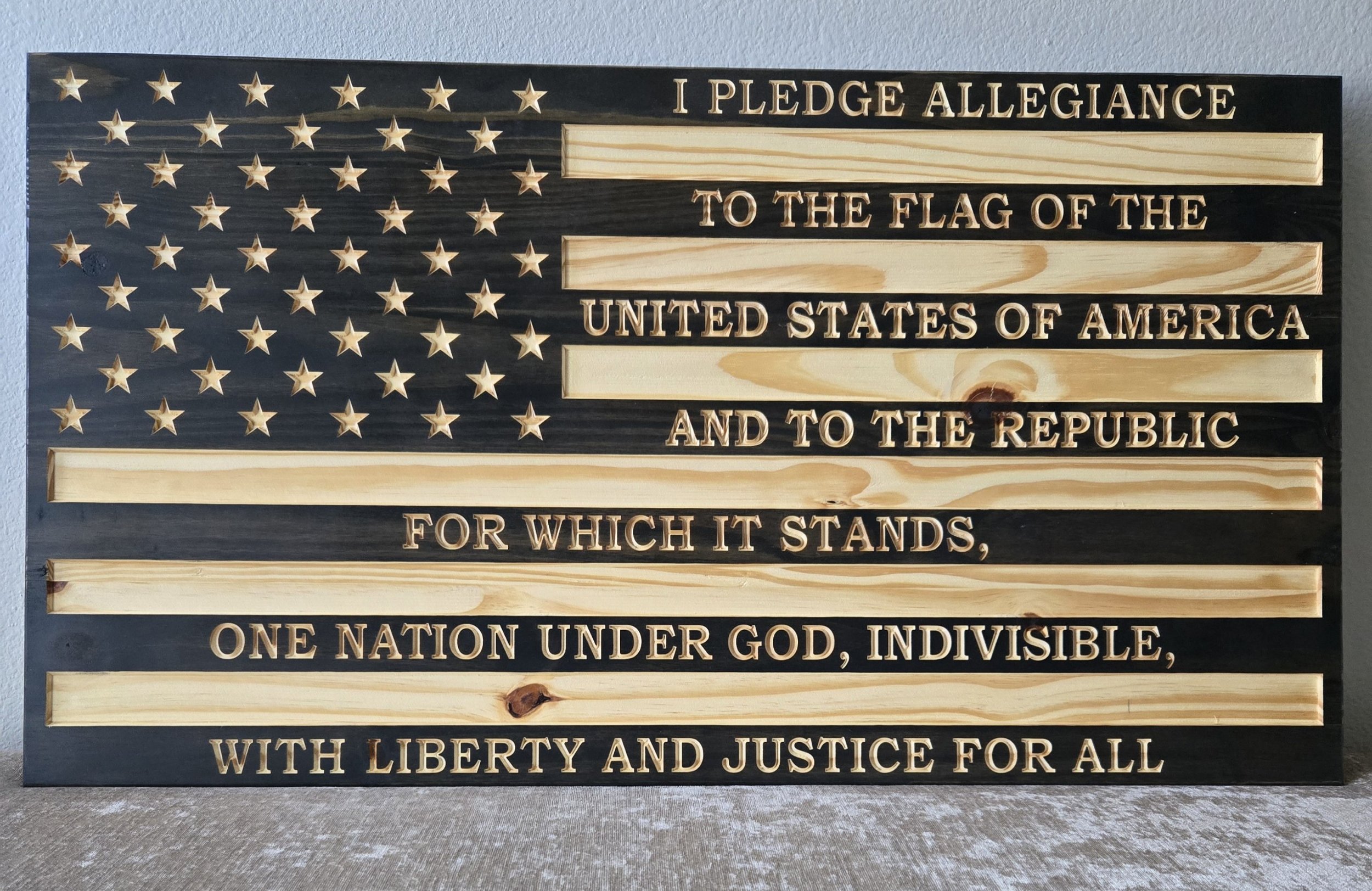 Celebrate craftsmanship and patriotism with our custom CNC-carved American flags. Each flag is precision-cut and deeply engraved from 3/4" select pine, showcasing the natural wood grain with a bold, contrasting finish. The detailed stars and carved lettering create a striking three-dimensional effect that stands out in any setting — from homes and offices to workshops and gift displays. All designs can be personalized!